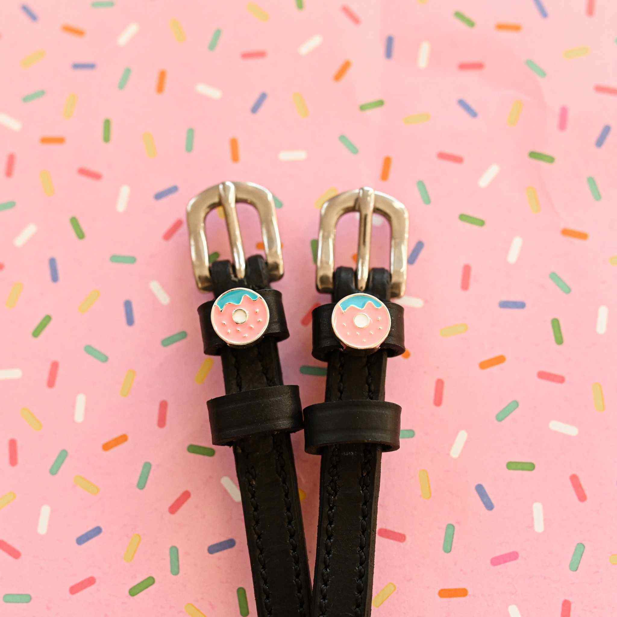 Fun, colorful spur straps with our signature donut print. Non stretch leather, easy to adjust, and finished with stainless steel buckles. They add a pop of personality to every ride — and yes, your trainer will absolutely notice.